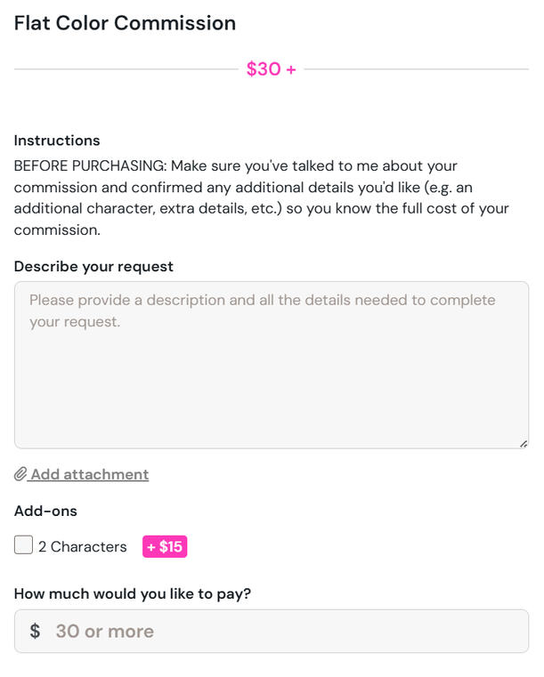 Head to my Ko-fi! When you're paying for a commission, the screen will look something like this. For this example, I'm using the flat color commission option.